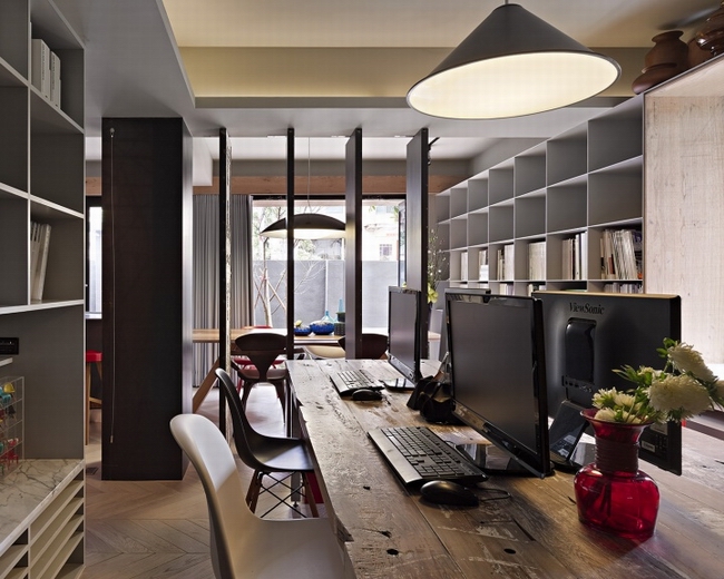 SOHO工作室双重功能设计,这个工作室设计案例是将这种双重功能的优势发挥到了极致,设计中将工作区和生活区分隔开来,安排在不同楼层,楼下为办公区,楼上为生活区,用楼梯或坡道来连接房间,这样就使居住者可以在同一公寓内享用独特的、不同的环境氛围,这个建筑包括了两个垂直相连楼层,内部被改造为一名艺术爱好者的办公室、工作间和居室,由于建筑师采用了将两个部分连接的同时又保持各自独立的设计,两部分之间的关系就显得尤为重要。