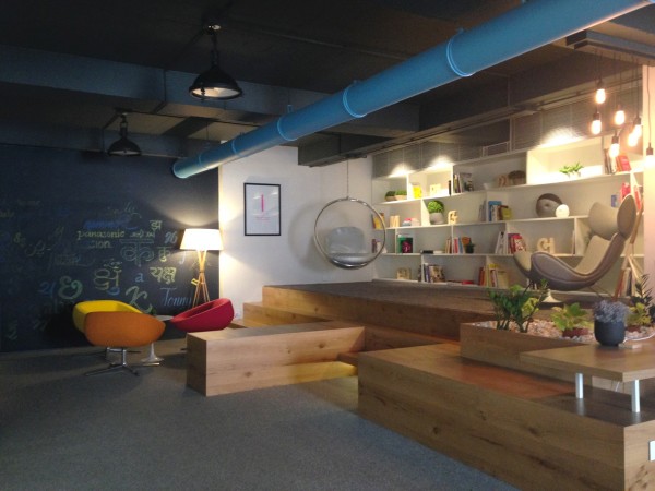 字体设计公司办公室装修,字体设计公司为Apple、Google Inc等大型科技公司服务,办公区域设计使用湖蓝色的微妙点缀起到了调节气氛的作用并且使空间设计有点地中海风格的意思,办公区域天然的木质的办公家具使空间更温馨,绿植的点缀也让整个空间变得舒缓而安逸,办公室设计最受欢迎的区域应该就是休闲区了有点像自己书房的感觉,可以躺在摇椅上看书也可以坐在吊椅上看书,还有一个涂鸦墙当灵感来的时候在涂鸦墙上随意挥洒自己的灵感。