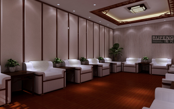 中式风格会议室装修效果图,这个会议室装修大部分使用的都是现代风格装饰元素,能体现中式装饰风格的设计元素是会议室装修顶部的吊顶以及灯具的使用分部采用了中式元素的设计风格。会议室中式效果图由迪家办公室装修公司(
