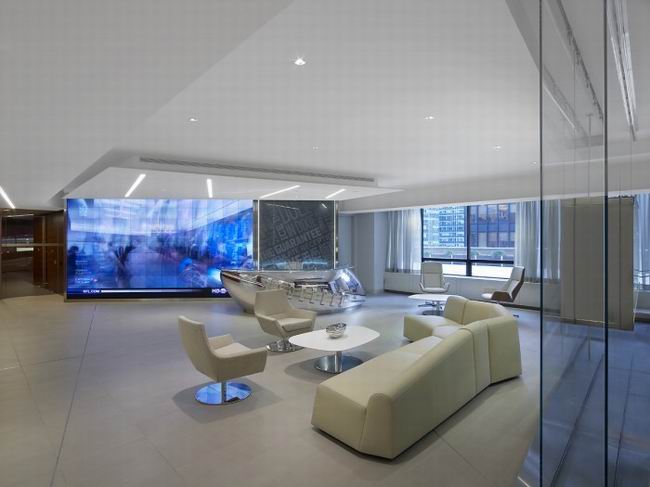 高端大气国际化办公室装修设计,整个空间设计大部分选用了灰白色的冷色调十分的高端大气国际化办公室装修设计,空间设施齐全,办公室前台设计是月亮型的搭配对面接待区一组真皮拐角沙发提升了整个前台空间的档次,小会议室吊顶装饰采用了波浪形的咖啡色木吊顶给人