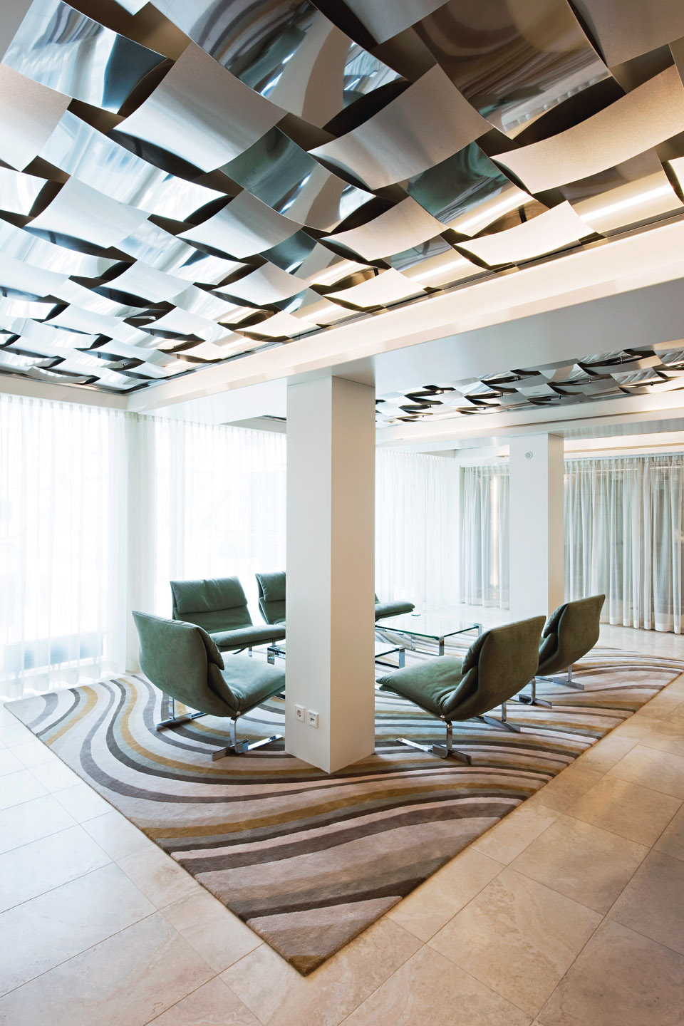 在遵守以上原则的基础上还可以玩出创意,由于办公室房顶不够高,不可能悬挂灯饰。因此设计师想到用扁平状物体来代替。设计师想要传递了“永恒”的信息在天花上悬挂了9000个铜环,这些铜环永远都会有利用价值,可以有效避免浪费。