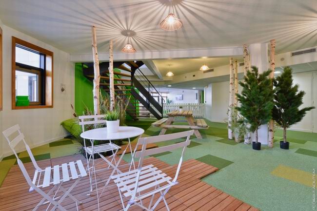 草原风格办公室内装修,由于办公室总体面积的30%都用来布置非正式办公空间,草原风格的空间就是这样被设计出来了。这个空间可以供人们进行非正式的沟通与交谈,其设计的灵感来源于木制凳子和桌子的自然气氛。这种大胆前卫风格的办公室设计一般只有国外业主能