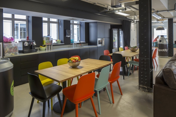 折衷主义空间办公室设计,数字音乐服务公司设计我们的设计团队设计了一个带有华丽丝绒、皮革和木材的折衷主义空间。我们的设计同样还融合了一个面积很大的音频视频元件,其中包括有遍布了办公室的一个音响系统。我们与Spotify的专业团队进行了直接的合作,我